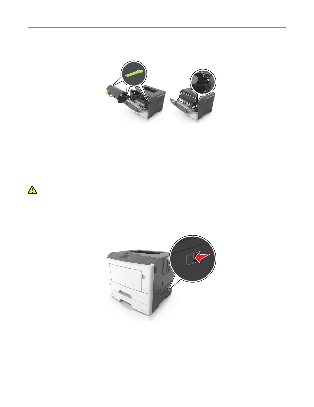 7 Insert the toner cartridge into the printer by aligning the side rails of the cartridge with the arrows on the side rails