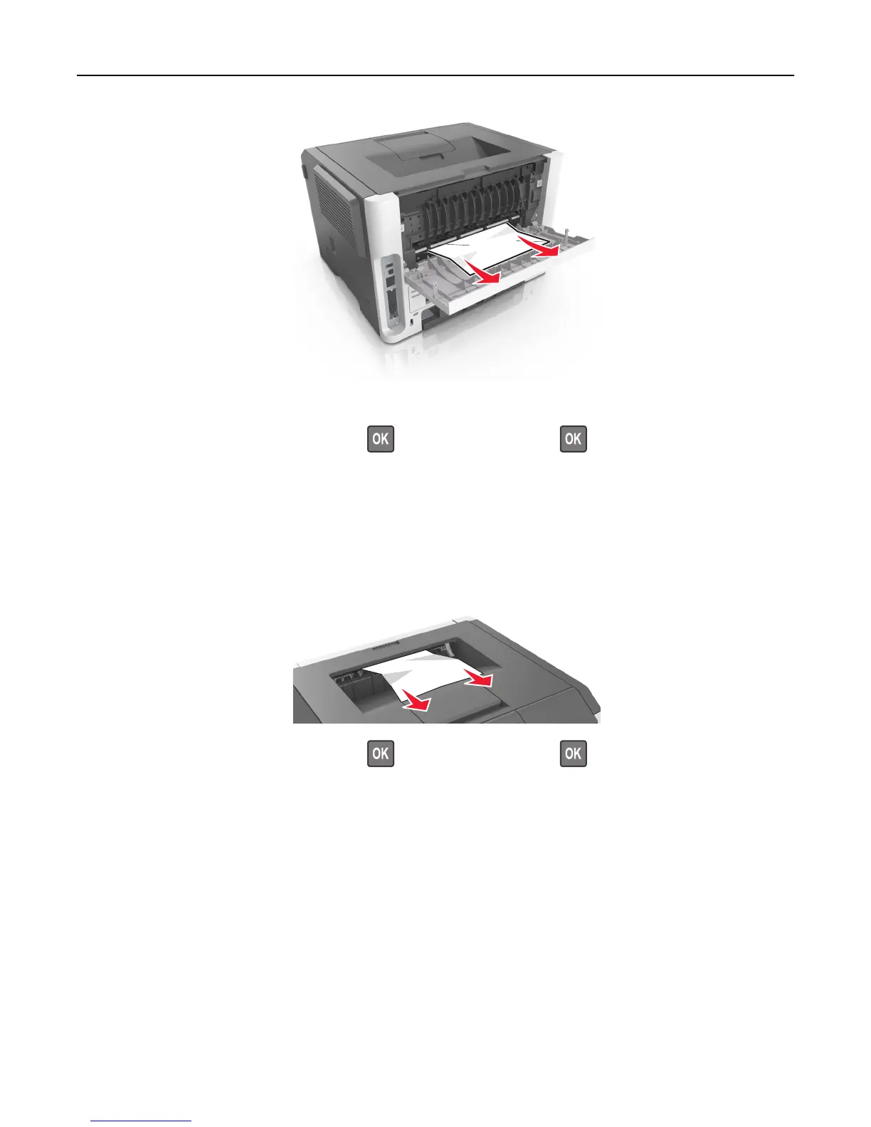 5 From the printer control panel, select Next > > Clear the jam, press OK > to clear the message and continue