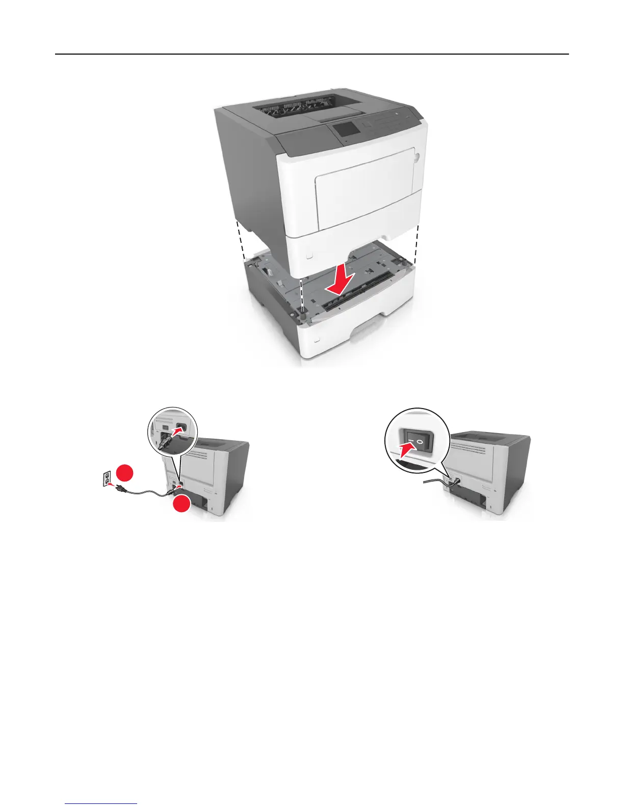 8 Connect the power cord to the printer, then to a properly grounded electrical outlet, and then turn on the printer.