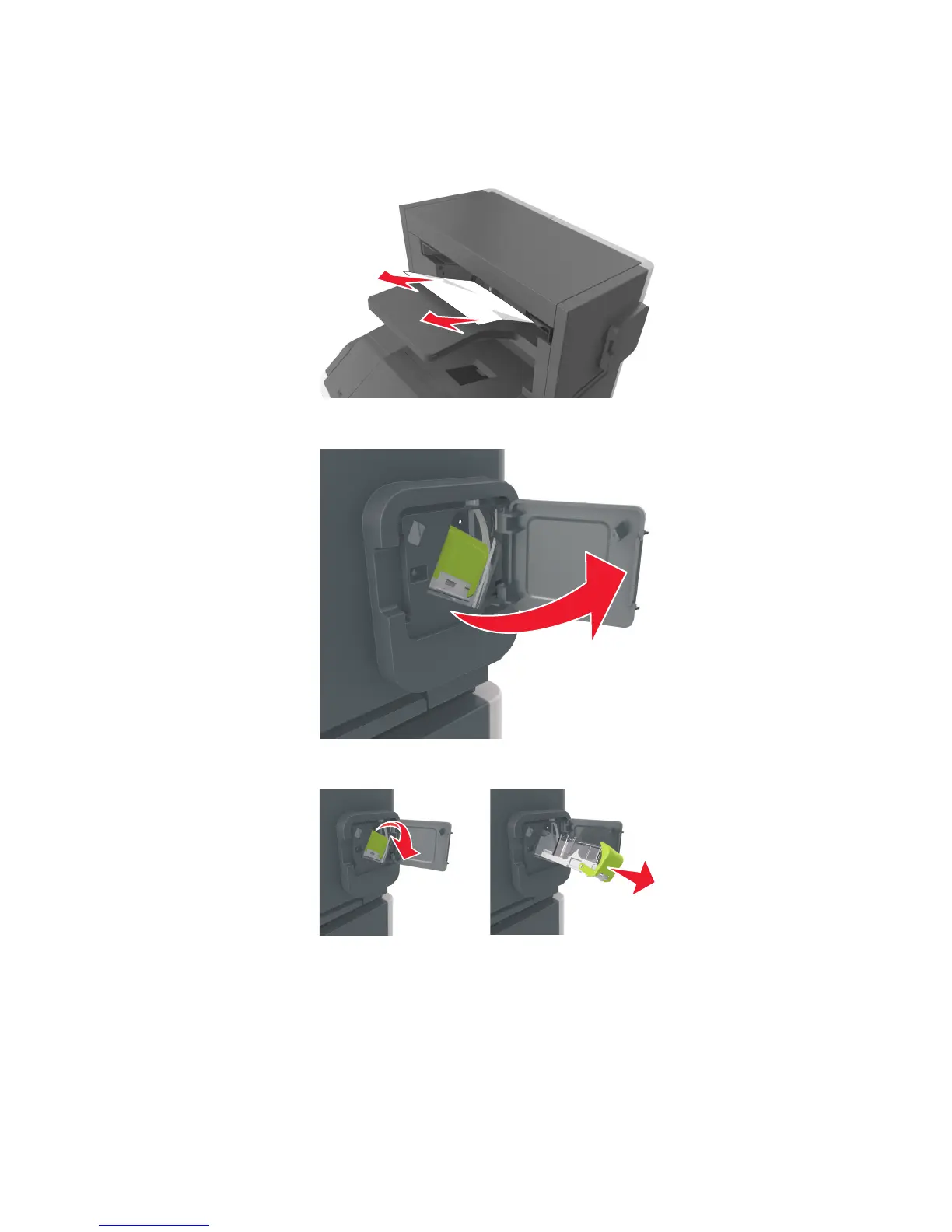 [x]āpage jam, remove paper, open stapler door. Leave paper in bin. [455ā457]