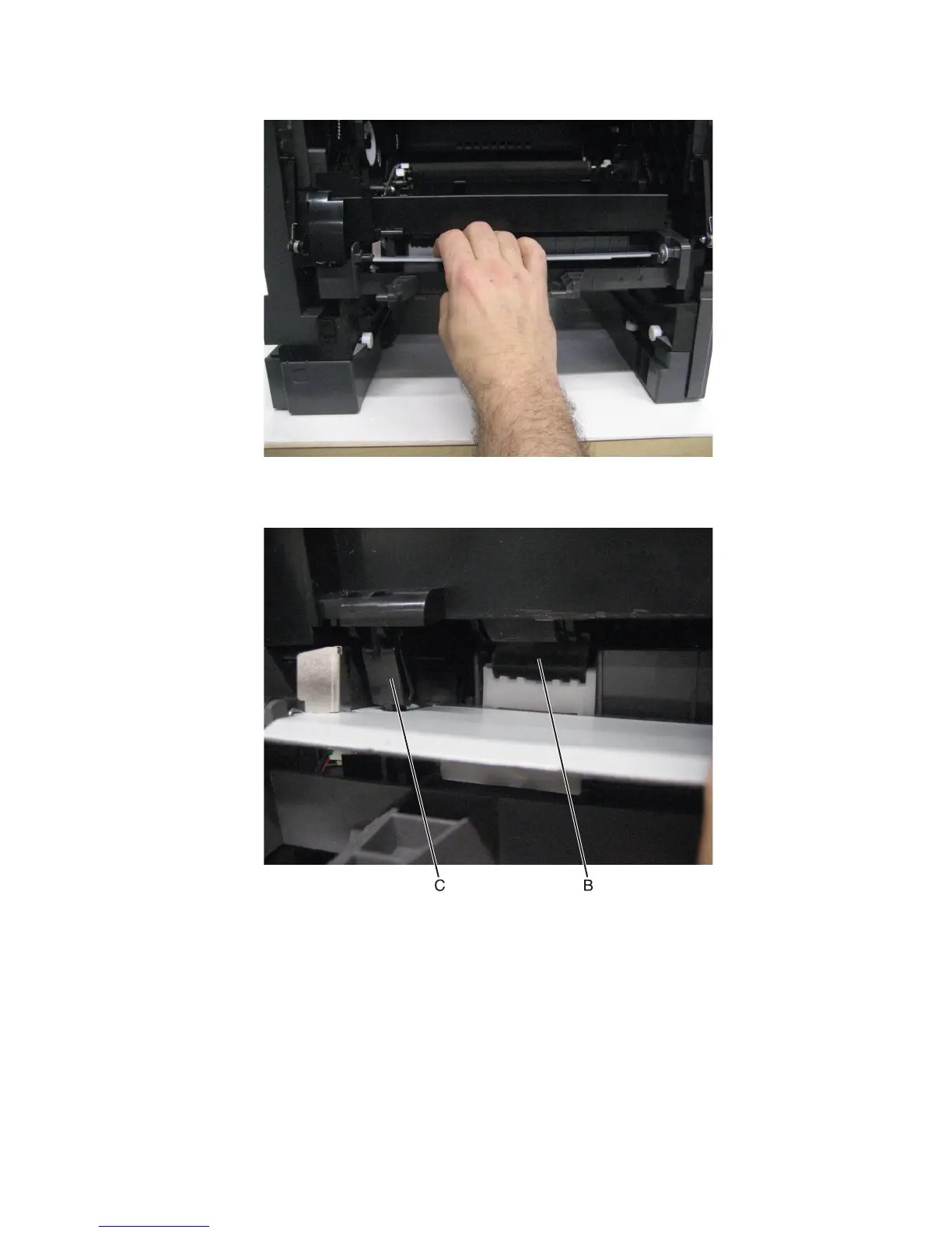 Installation warning: When replacing the MPF feeder lift plate ensure that the actuator flag (C) is placed in the