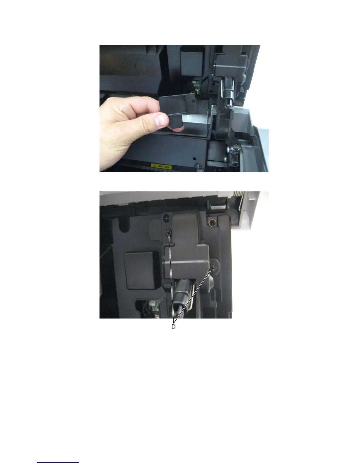 11 Remove the two screws (D) securing the right control panel hinge to the control panel.