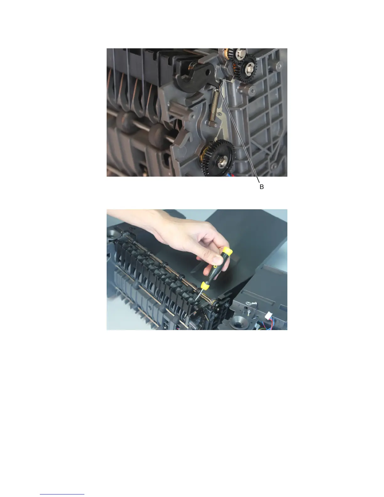 3 Pull away the frame to access the parts underneath. Release the hook (B) from the diverter.