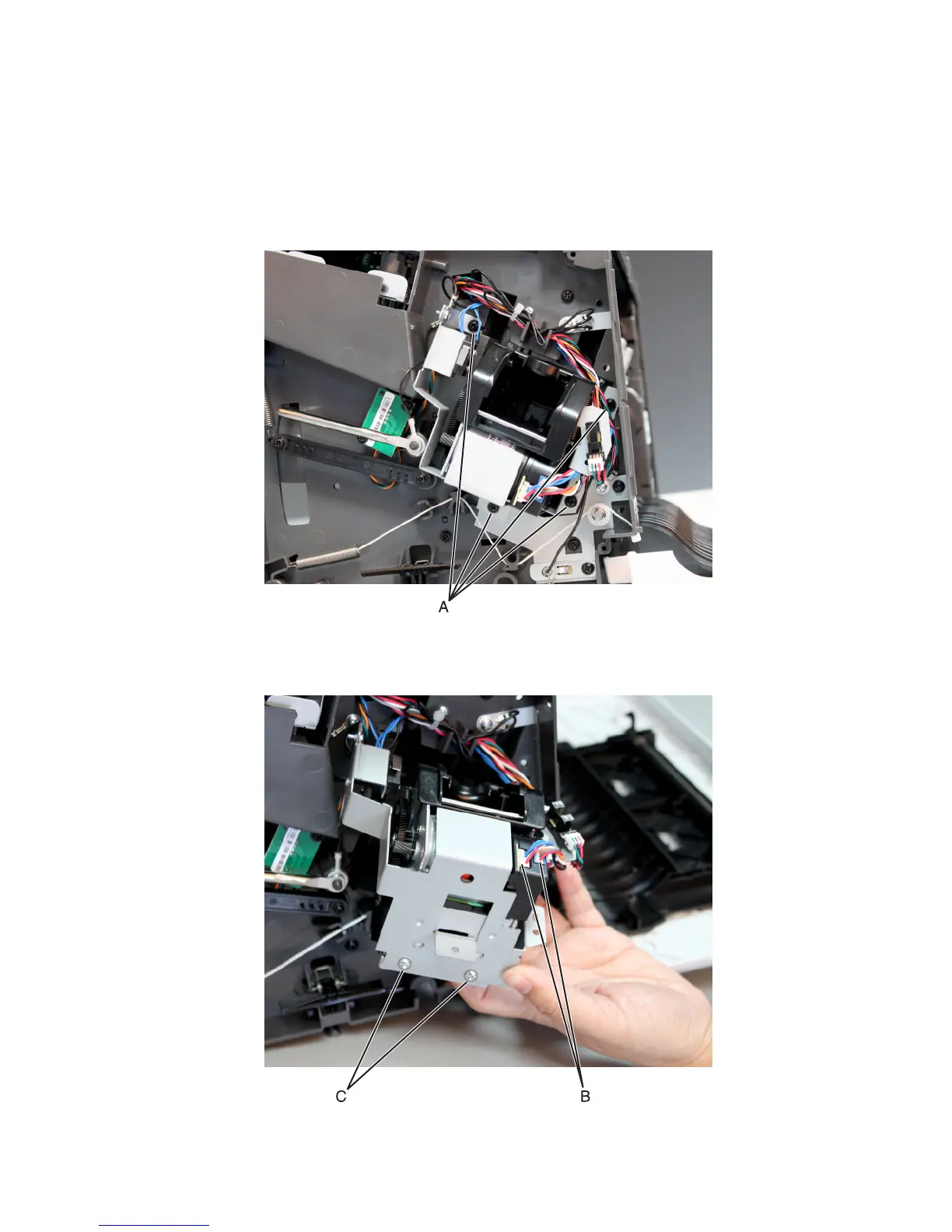 6 Lift the stapler carriage frame, then remove the two screws from the stapler carriage assembly (C).