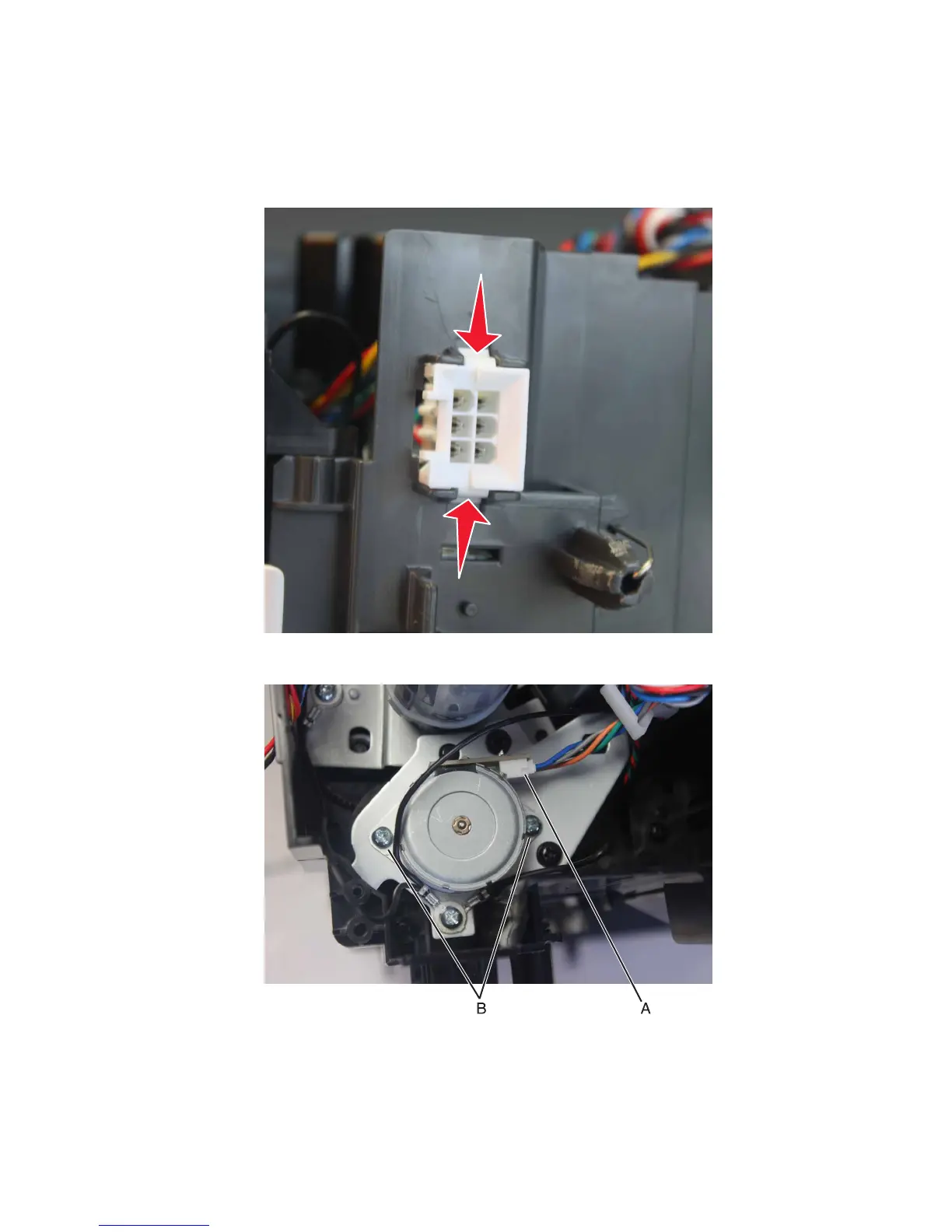 3 Disconnect the motor cable (A), and then remove the two screws (B) from the motor.