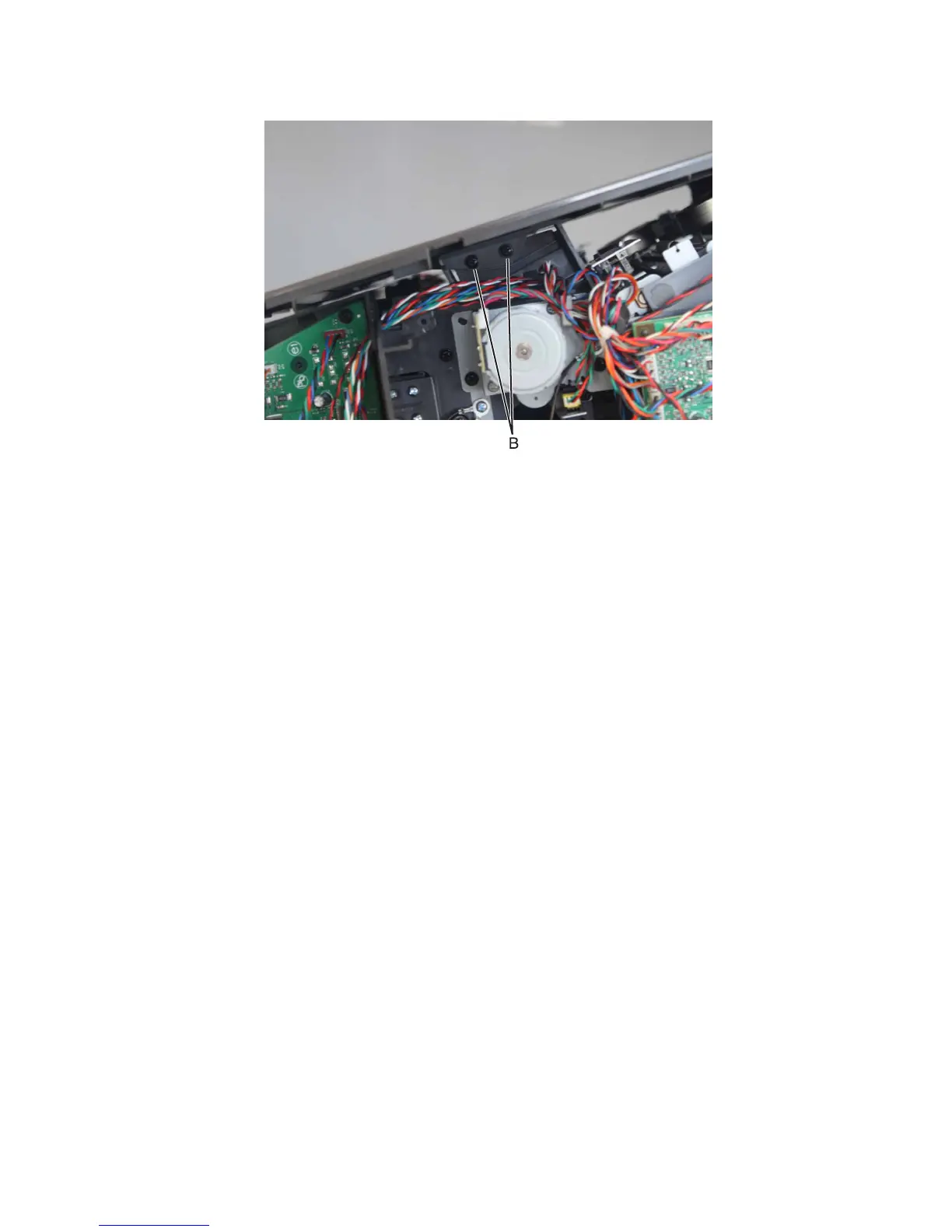 4 Remove the two screws (B) from the left side of the finisher.