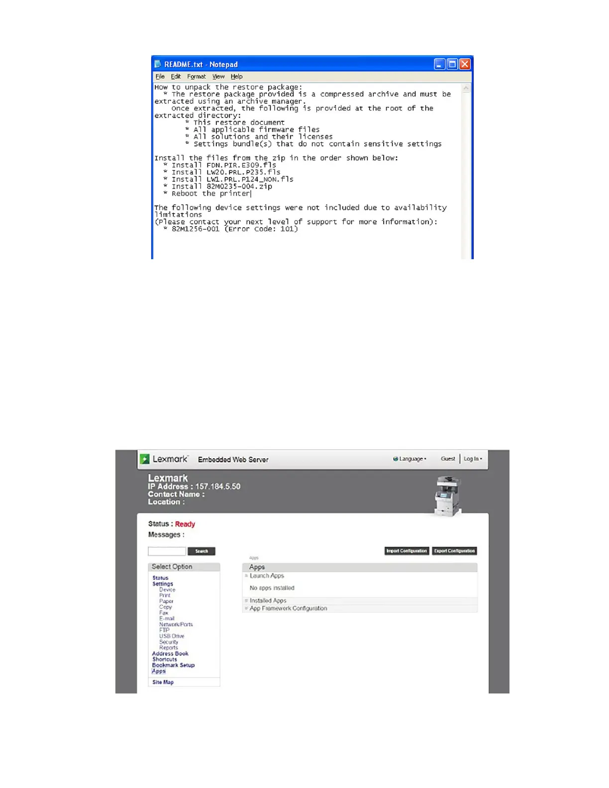 Lexmark M52 Series - Restoring Solutions, Licenses, and Configuration Settings