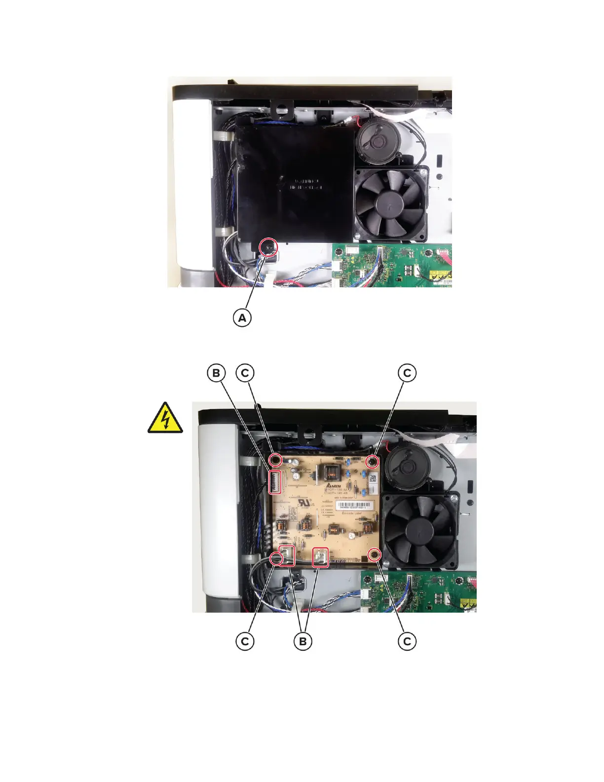 5 Disconnect the three cables (B), remove the four screws (C), and then remove the HVPS.