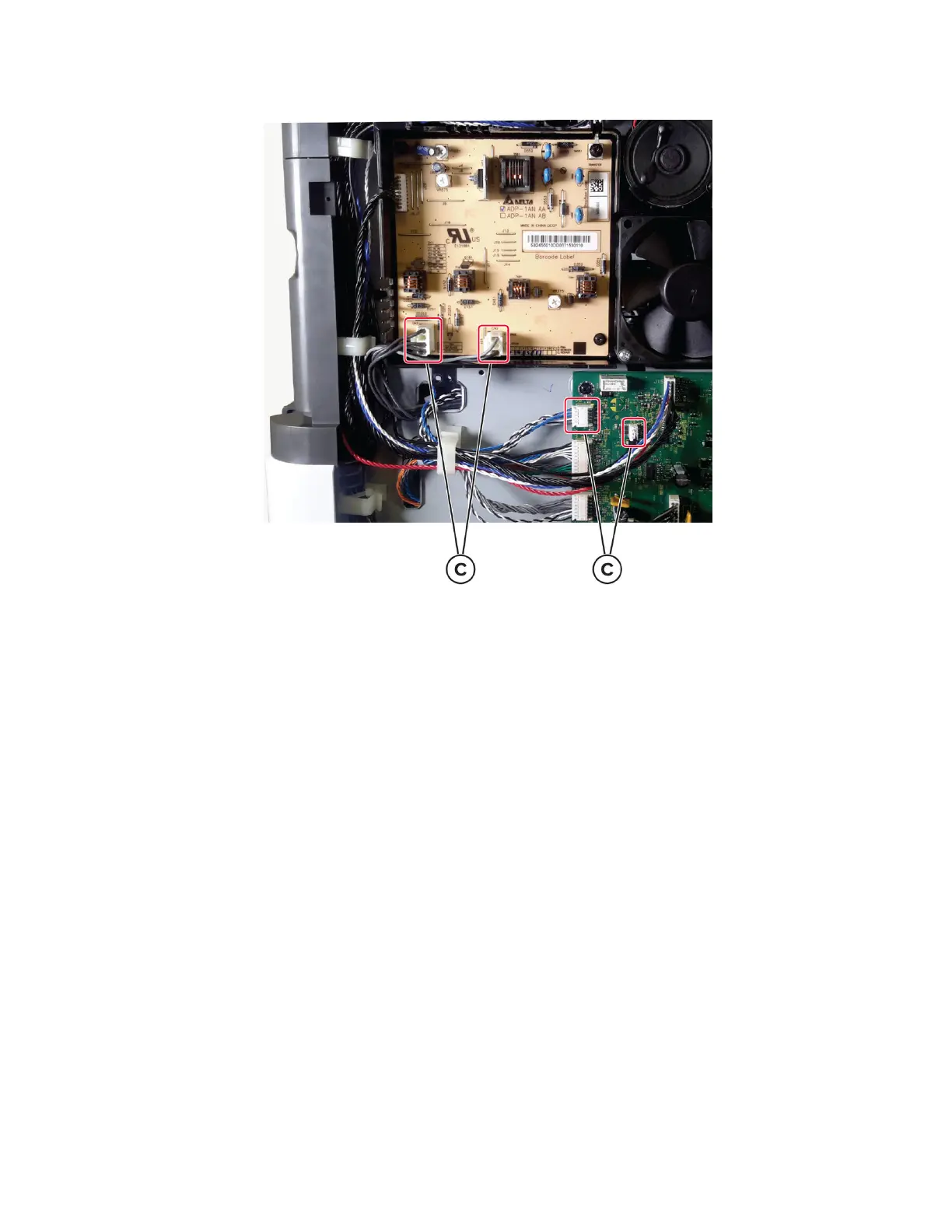 6 Disconnect the four cables (C), and then remove the high voltage contacts guide.