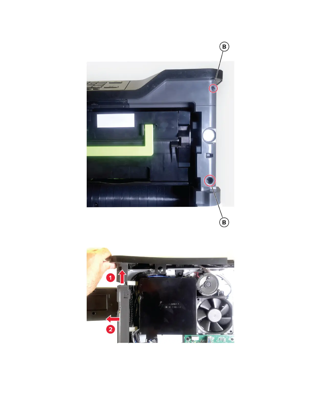 5 From the front side, remove the two screws (B).