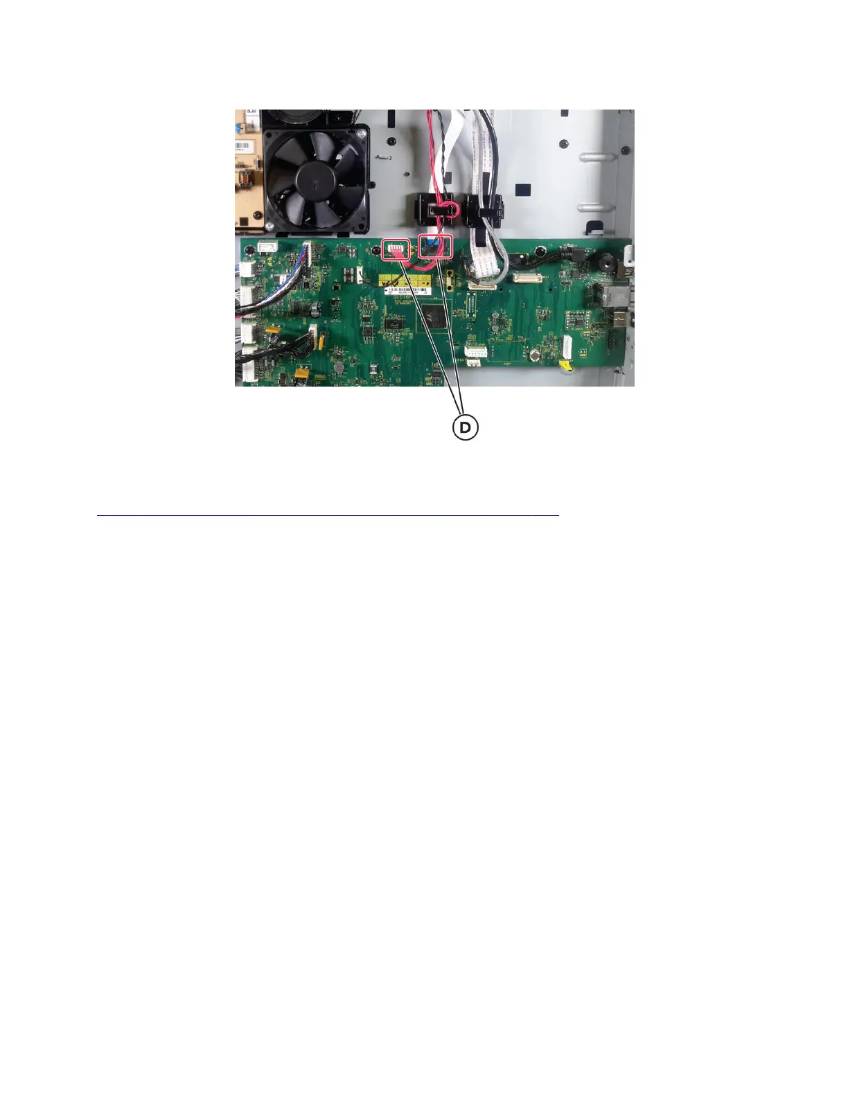 5 Disconnect the two cables (D) from the controller board.
