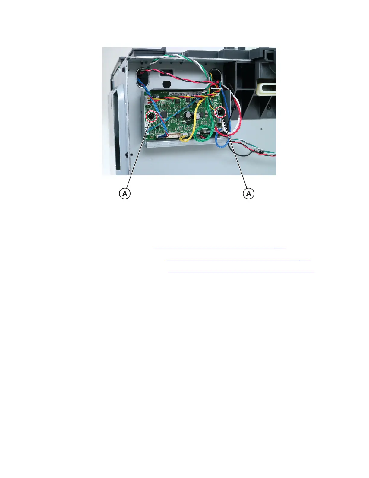 4 Disconnect all the board cables, and then remove the two screws (A).