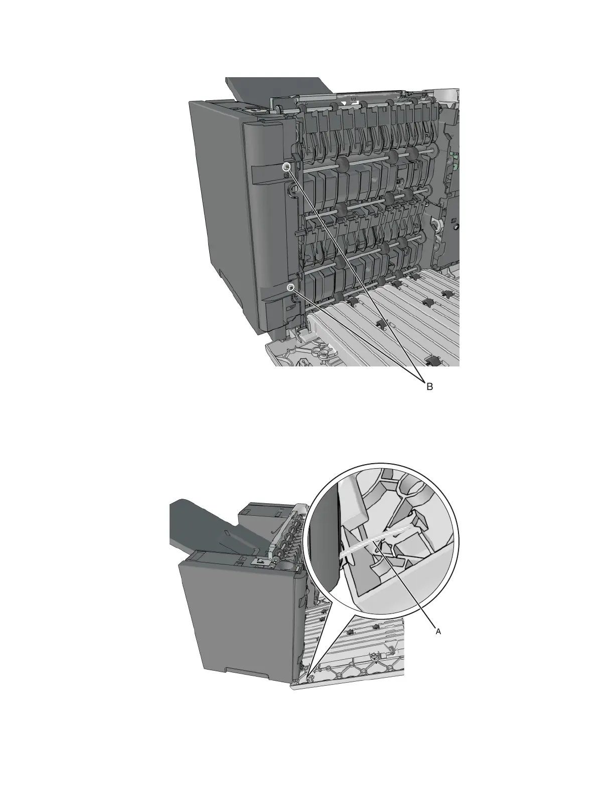 2 Remove the two screws (B), then remove the right cover.