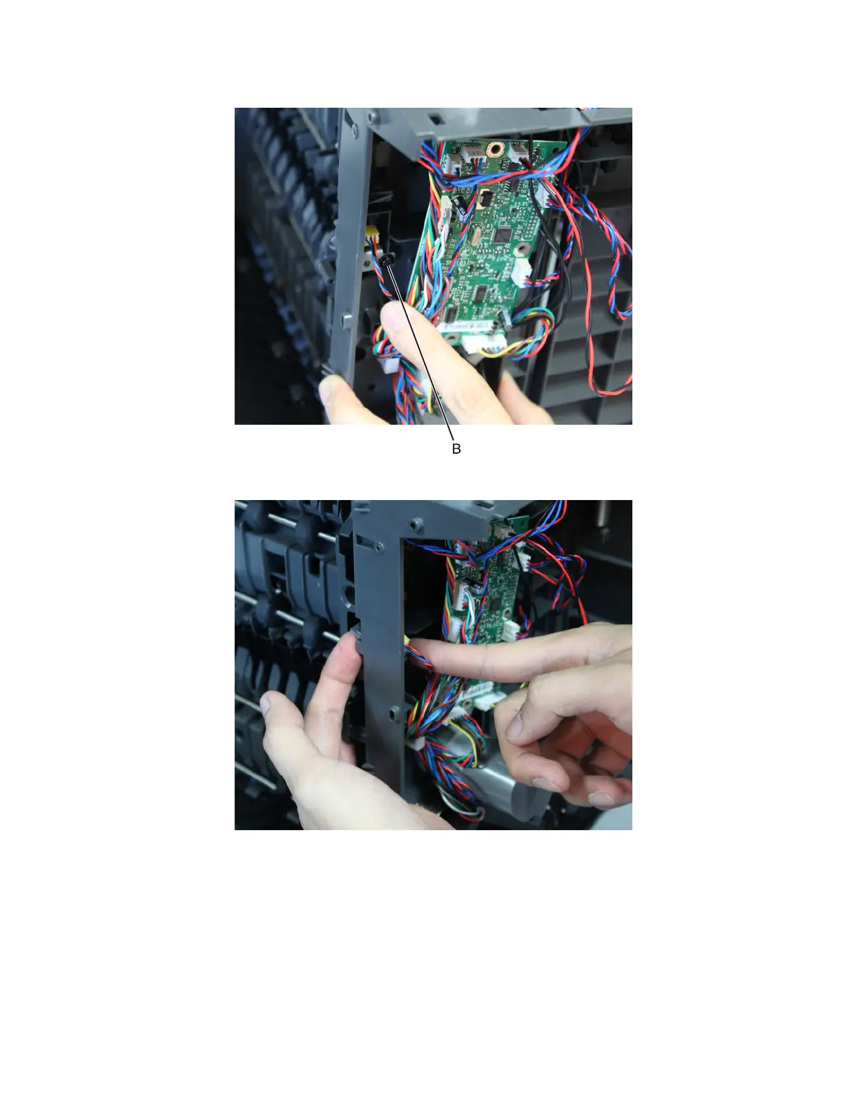 3 Slightly move the board to access and remove the screw (B).