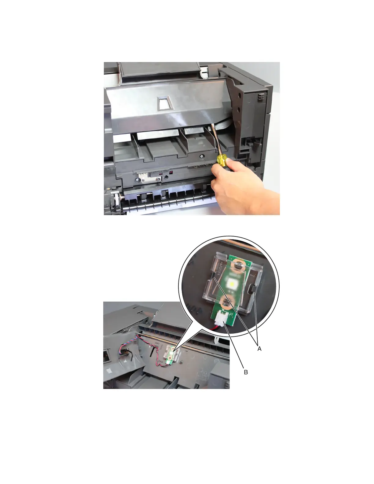 2 Release the latches (A), and then remove the LED lens. Disconnect the cable (B), and then remove the LED.