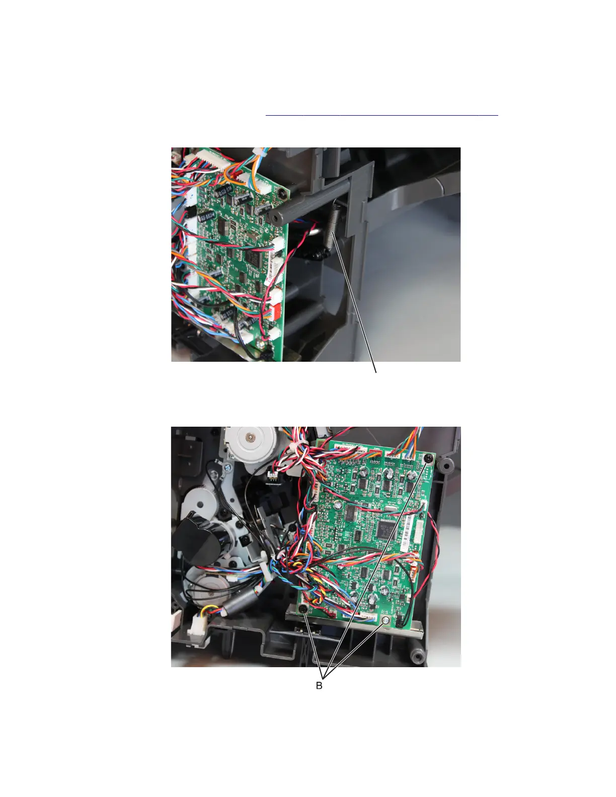 3 Remove the three screws (B), and then release the controller board. Move the board to access the link