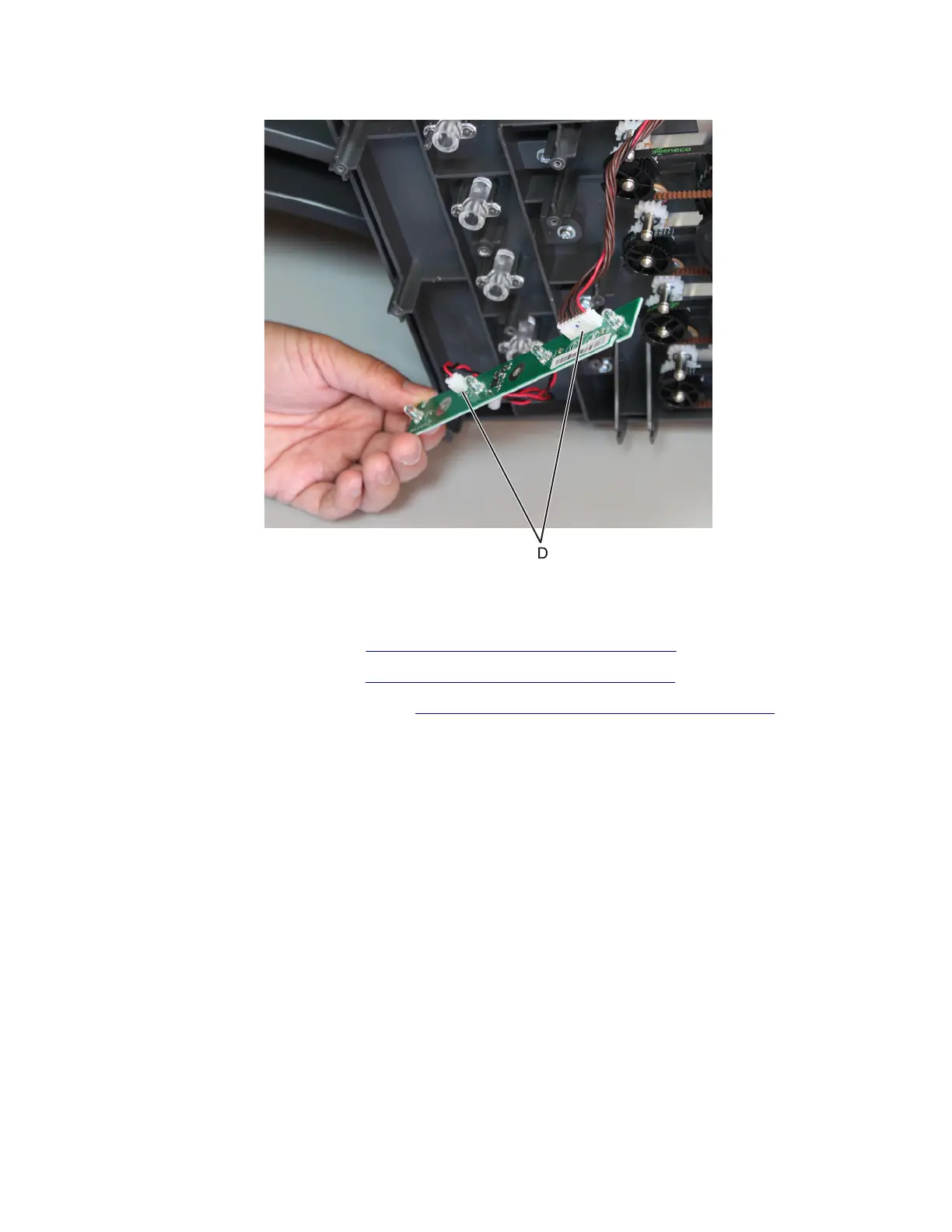 8 Disconnect the two cables (D), and then remove the bin LED assembly.