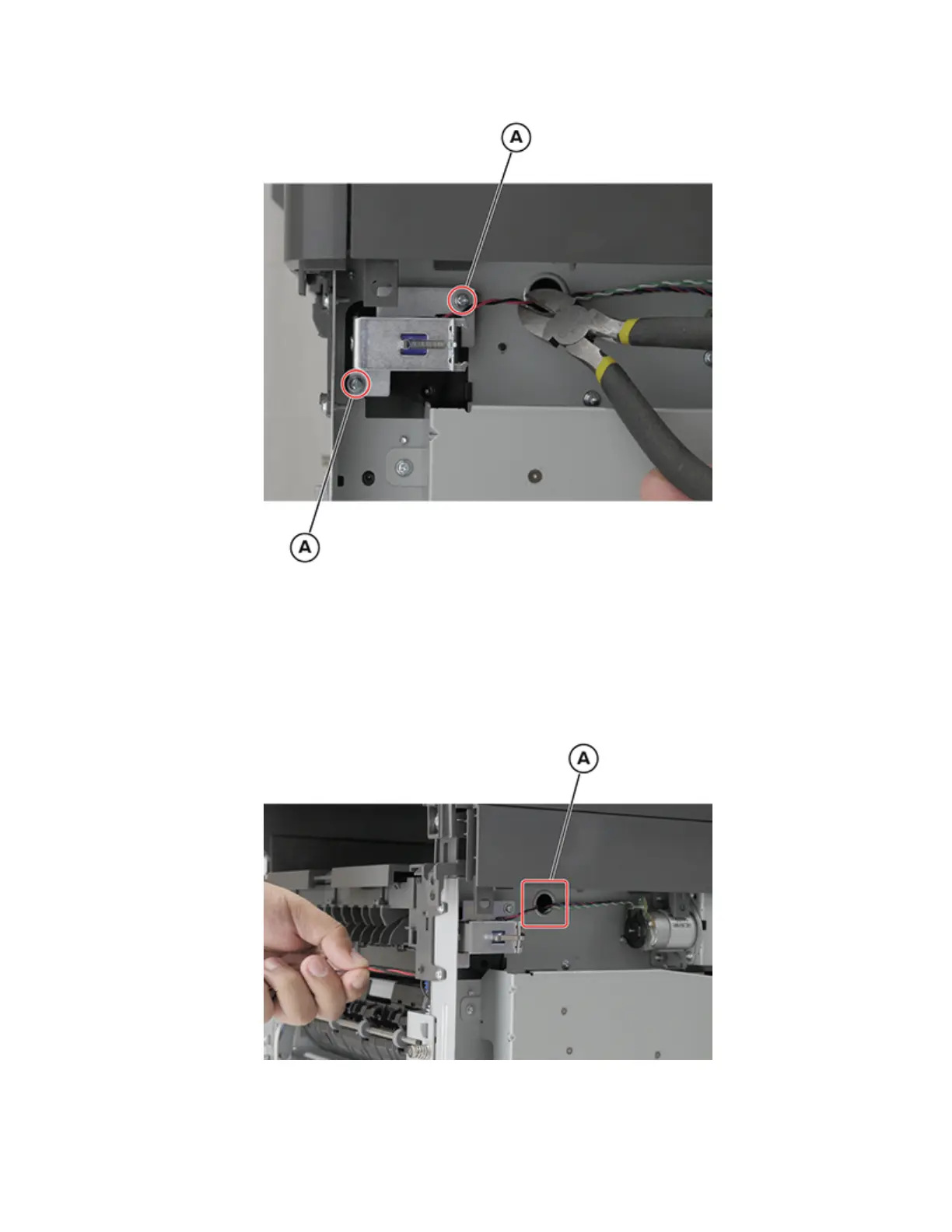 b Route the solenoid cable to the hole (A) exiting the rear side of the printer.