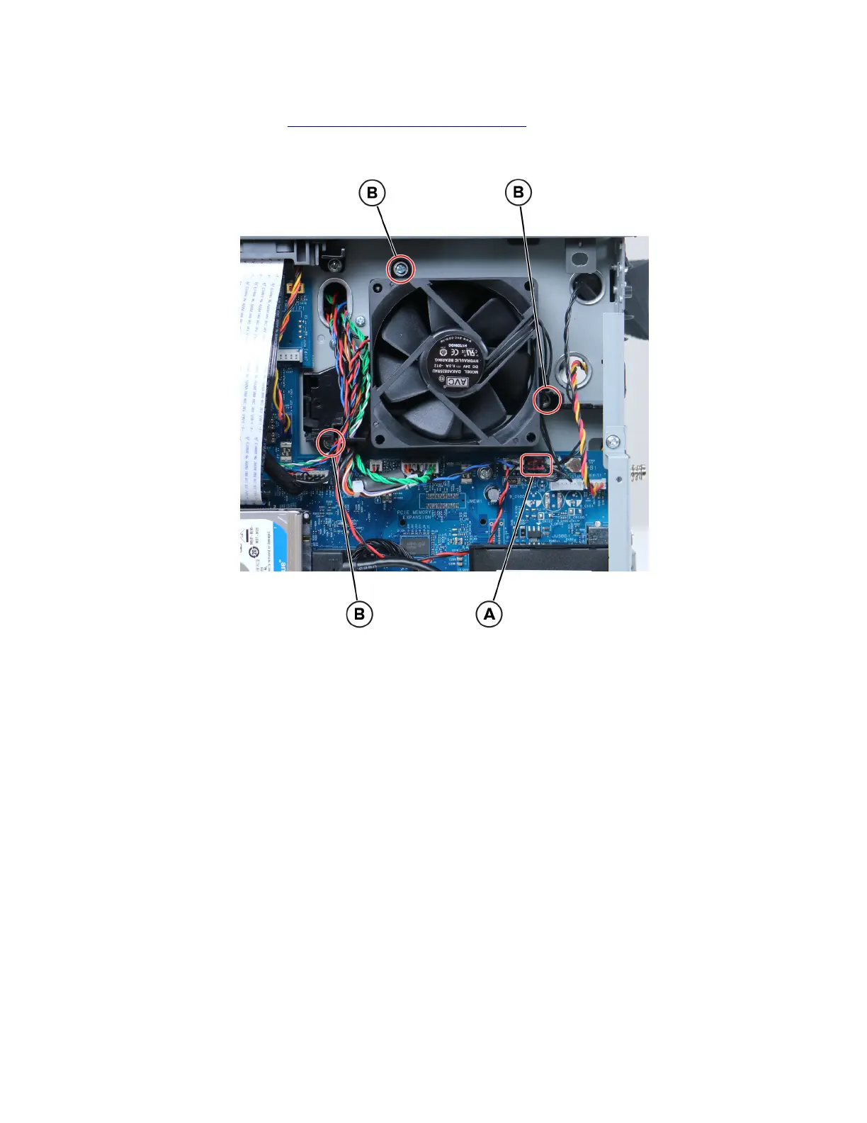 2 Disconnect the cable (A), remove the three screws (B), and then remove the fan bracket.