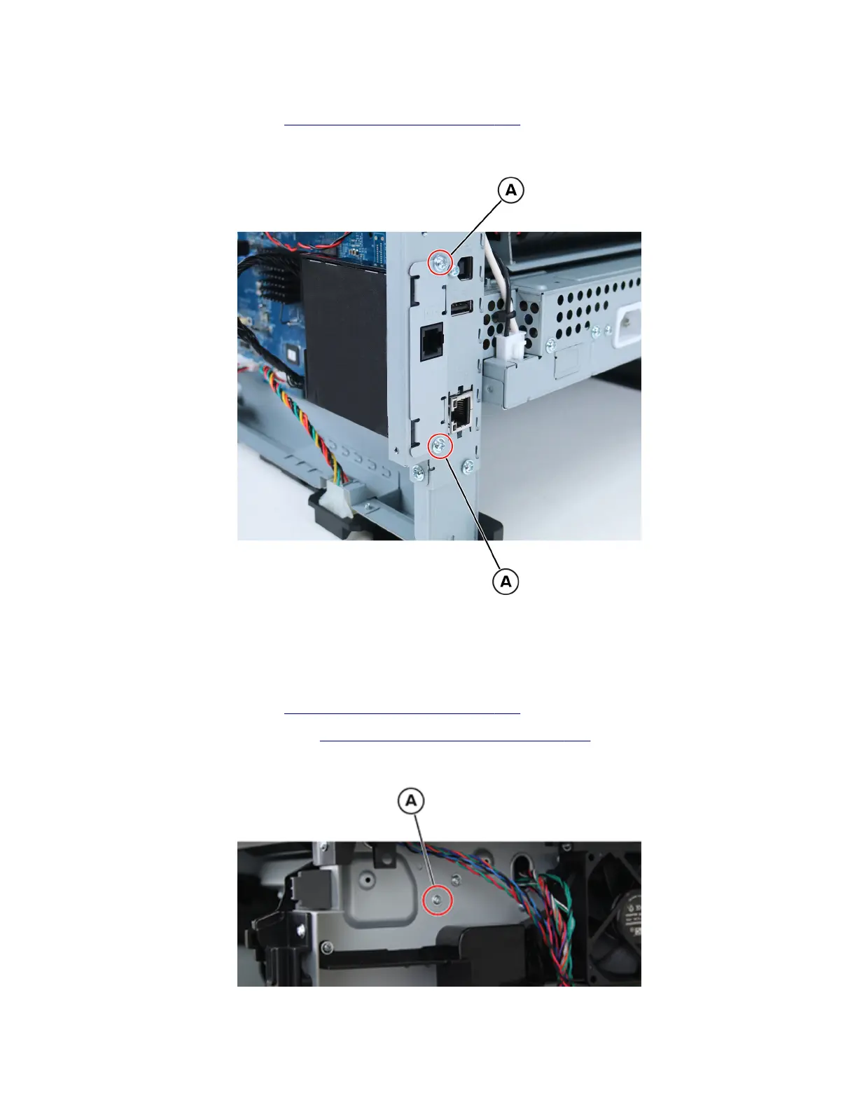 2 Disconnect the fax card cable from the controller board, and then remove the two screws (A).