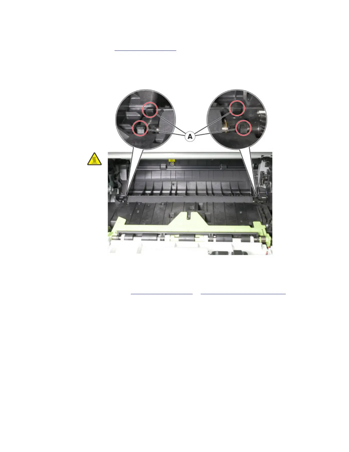 2 Remove the screw (A), and then release the cable from the jam access cover.