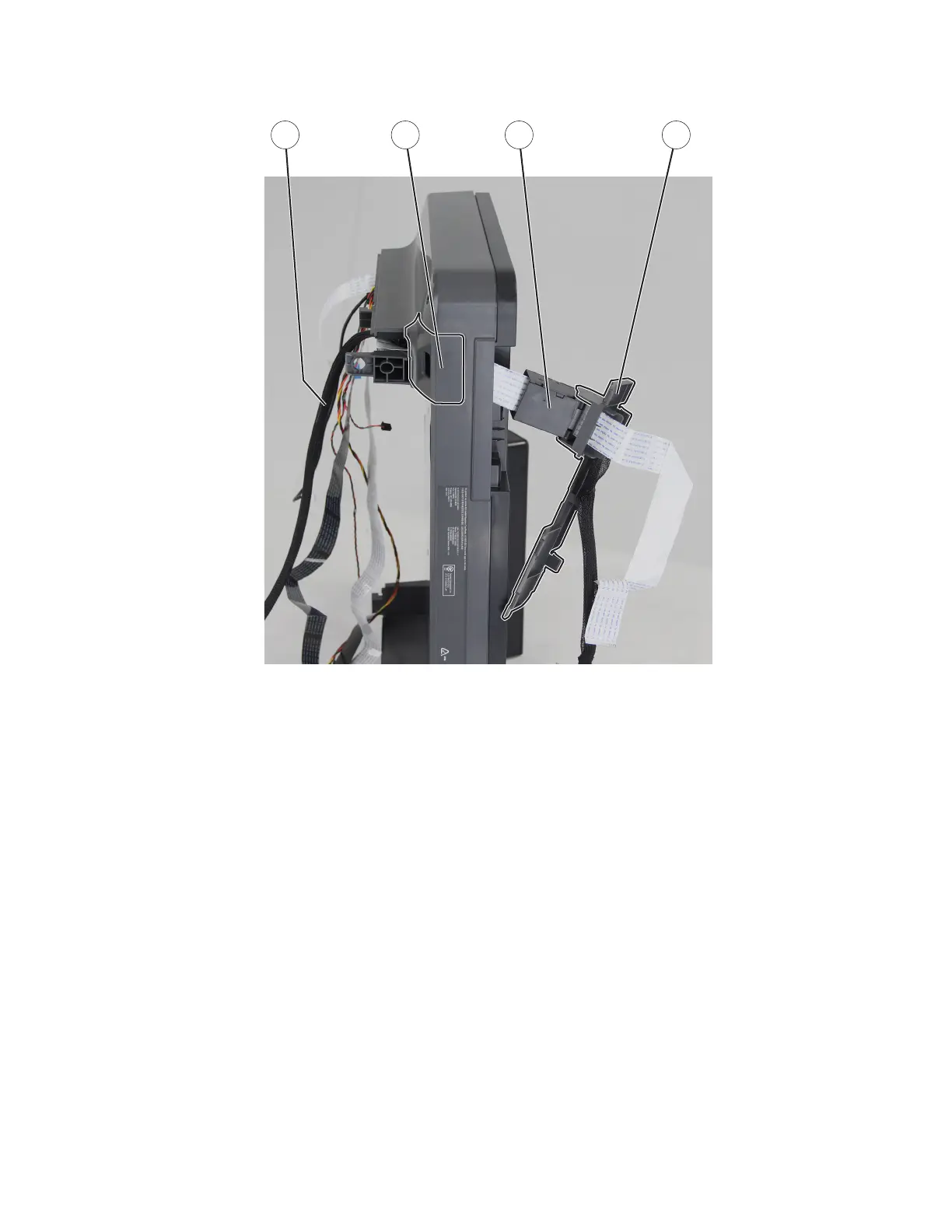 8 Route the ADF cable (E) o the flatbed assembly, and then remove.