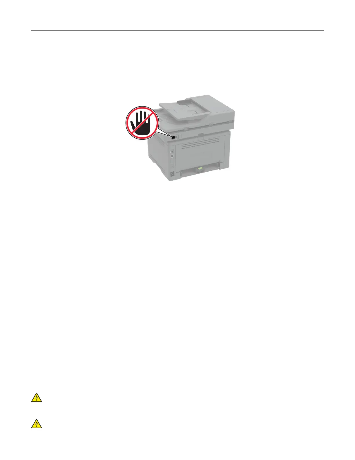 Warning—Potential Damage: To avoid loss of data or printer malfunction, do not touch cables or the printer