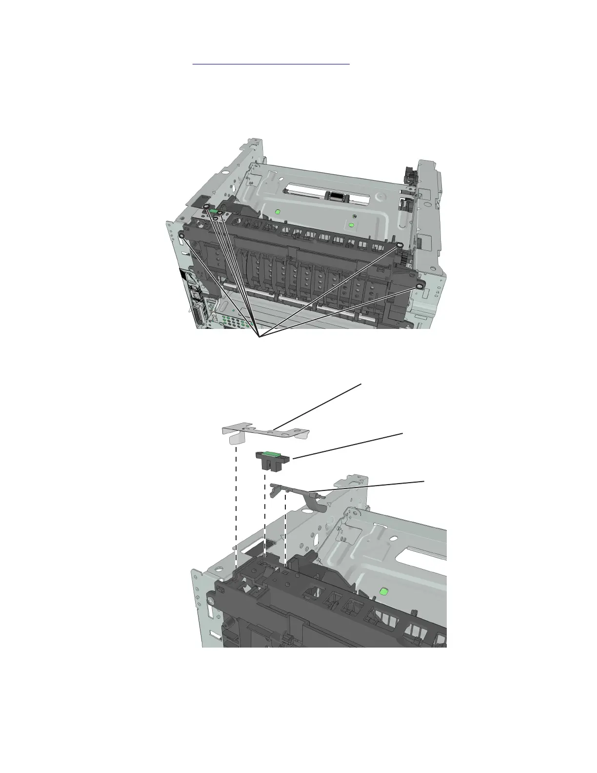 6 Remove the six screws (A) securing the sensor and upper exit guide to the redrive assembly.