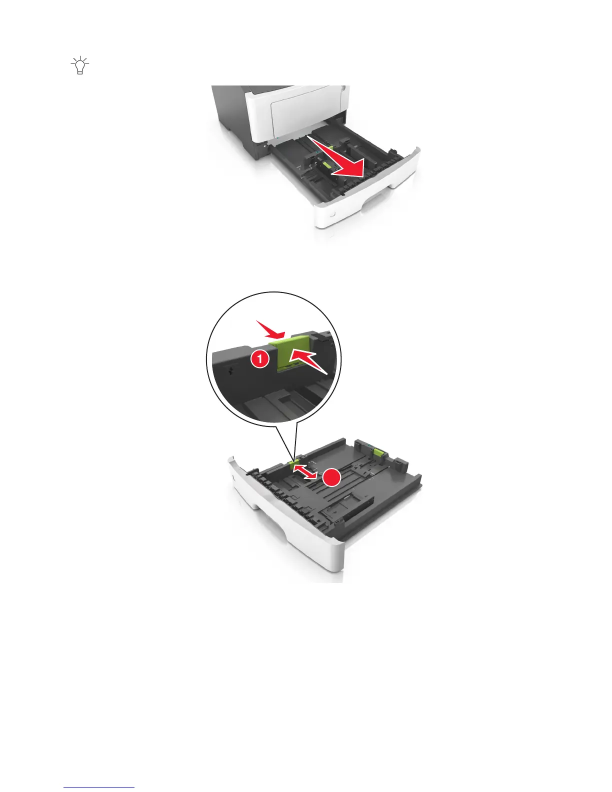 2 Squeeze and then slide the width guide tab to the correct position for the size of the paper you are loading.