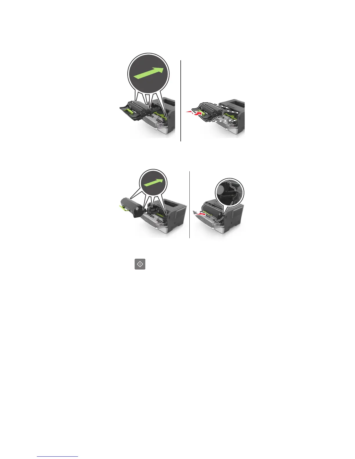 8 Insert the toner cartridge by aligning the side rails of the cartridge with the arrows on the side rails inside the printer,