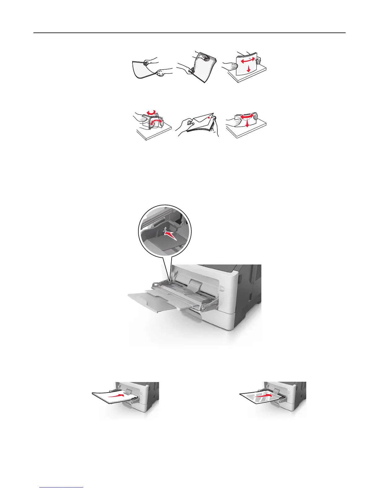 • Do not force paper into the multipurpose feeder. Overfilling may cause paper jams.