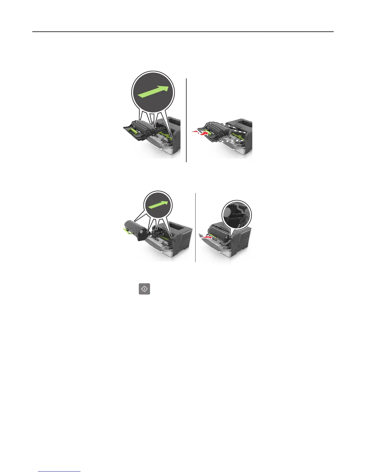 8 Insert the toner cartridge by aligning the side rails of the cartridge with the arrows on the side rails inside the printer,