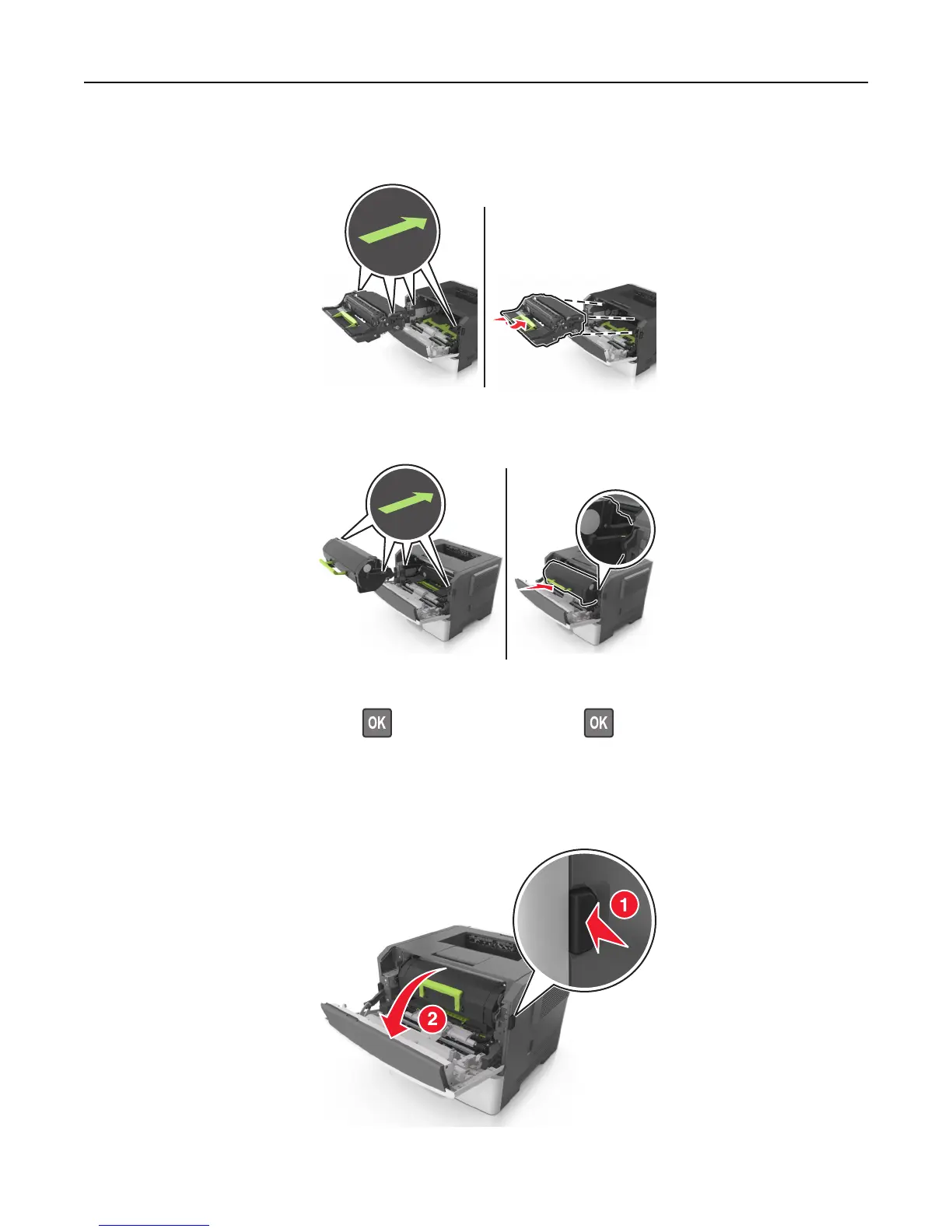 7 Insert the imaging unit by aligning the arrows on the side rails of the unit with the arrows on the side rails inside