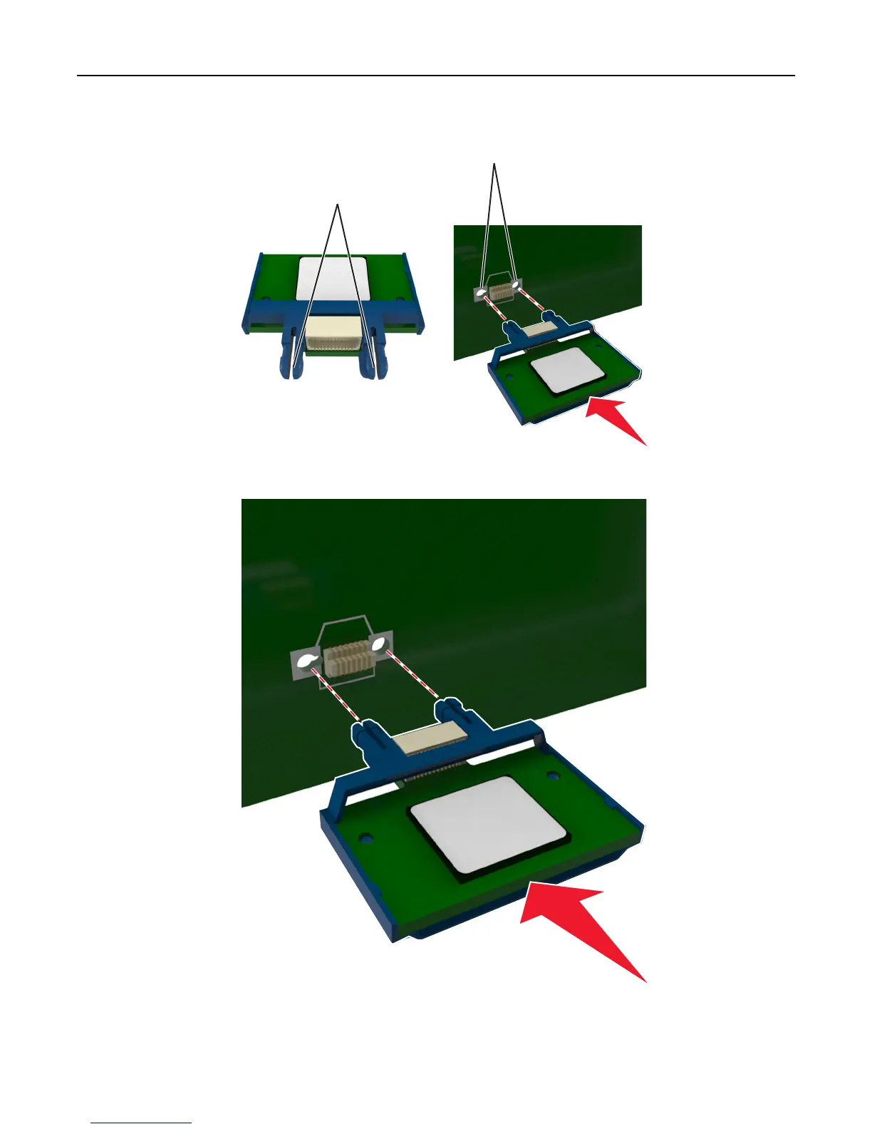 3 Holding the card by its sides, align the plastic pins (1) on the card with the holes (2) on the controller board.
