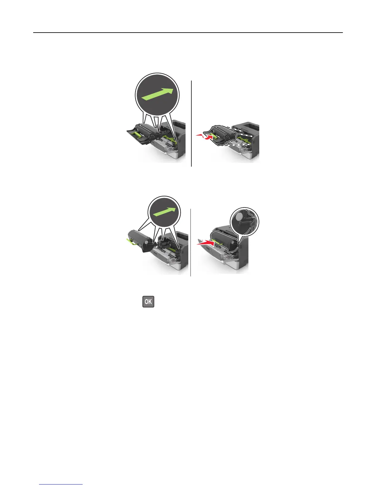 8 Insert the toner cartridge by aligning the side rails of the cartridge with the arrows on the side rails inside the printer,