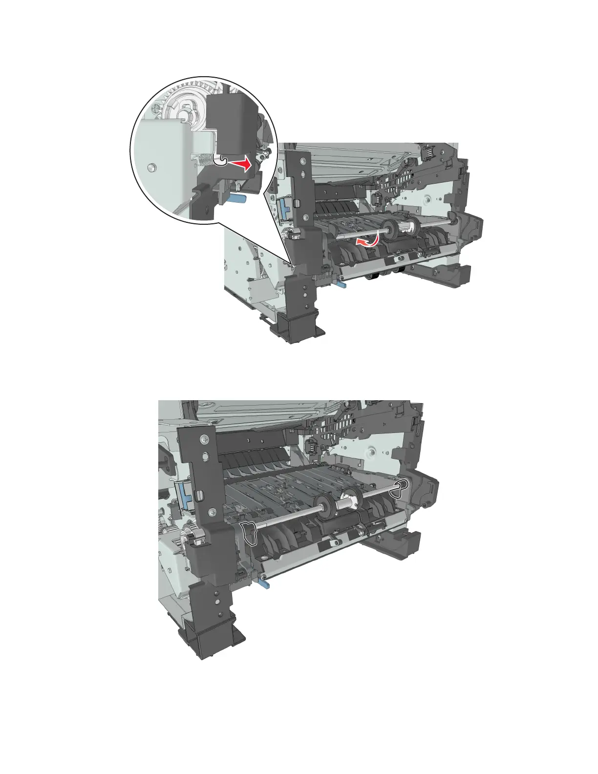 9 Rotate the MPF shaft inward so that the cams at each end point up.