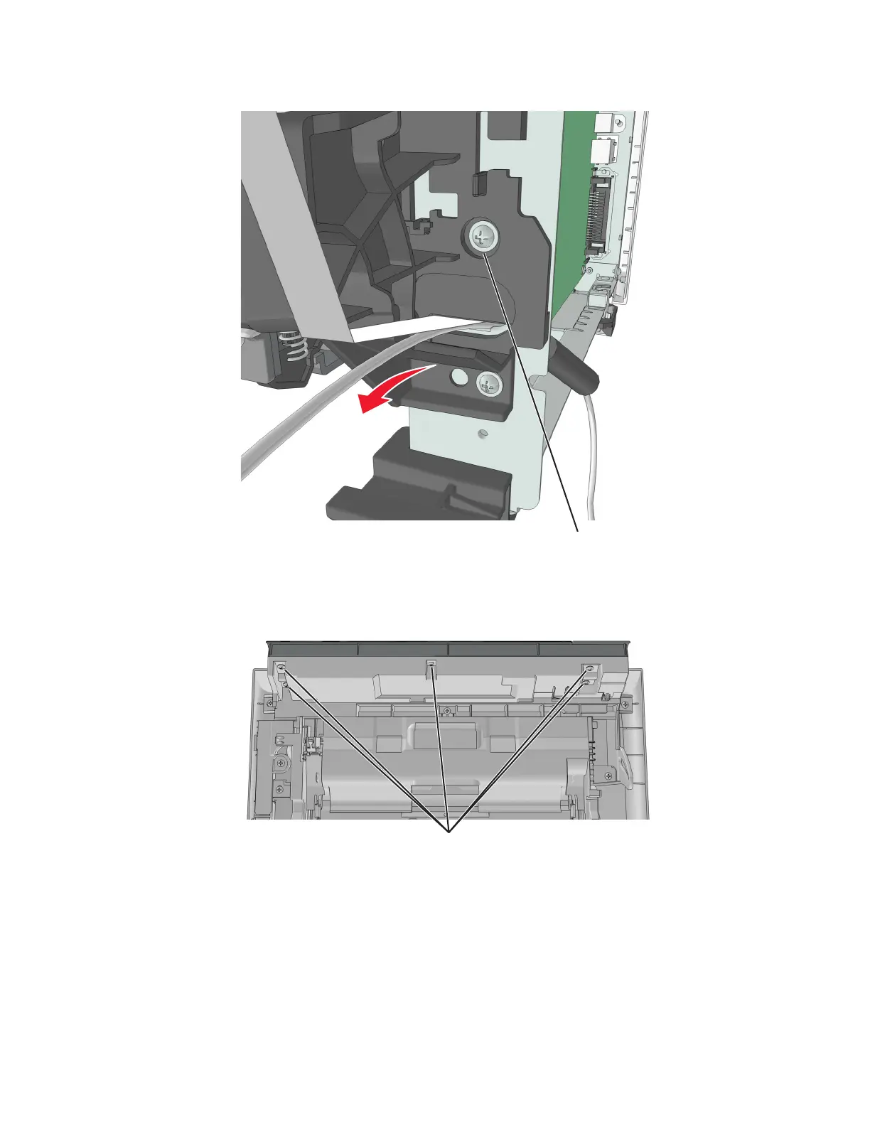 7 Remove the screw (B) from the right front mount, and route the cables through the slot.