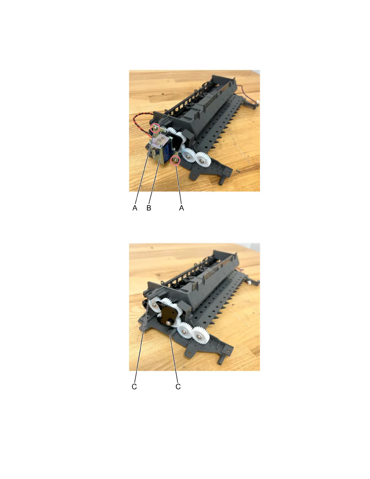 b Secure the solenoid to the screw holes (C) of the new redrive assembly.