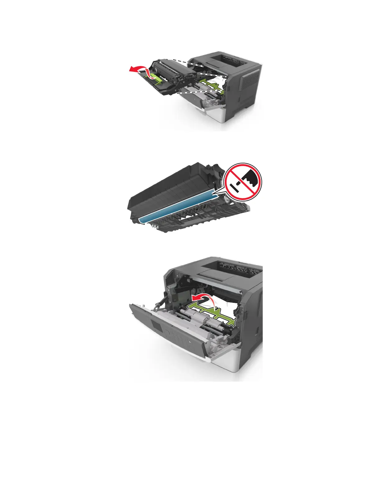 Warning—Potential Damage: Do not touch the shiny blue photoconductor drum under the imaging unit.