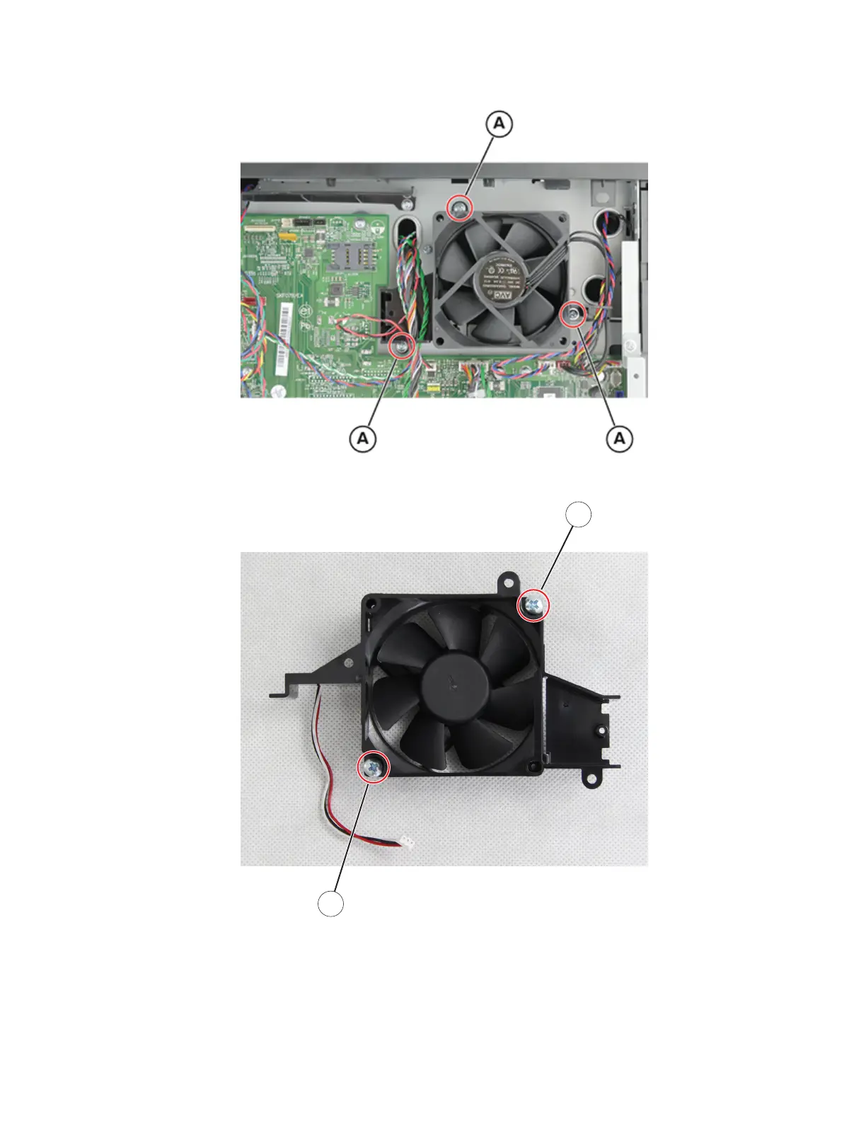 4 Remove the two screws (B), and then remove the fan.
