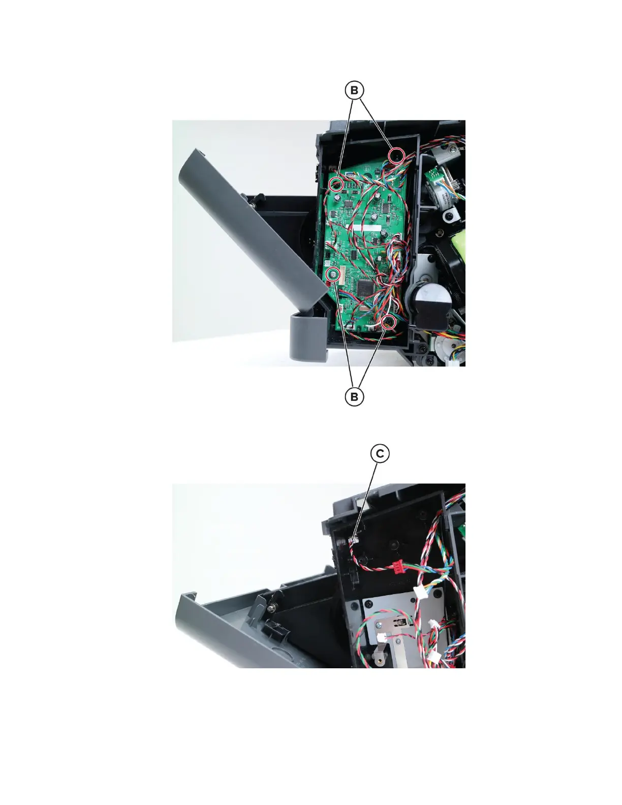 4 Disconnect all the HPU controller board cables, remove the four screws (B), and then remove the board.