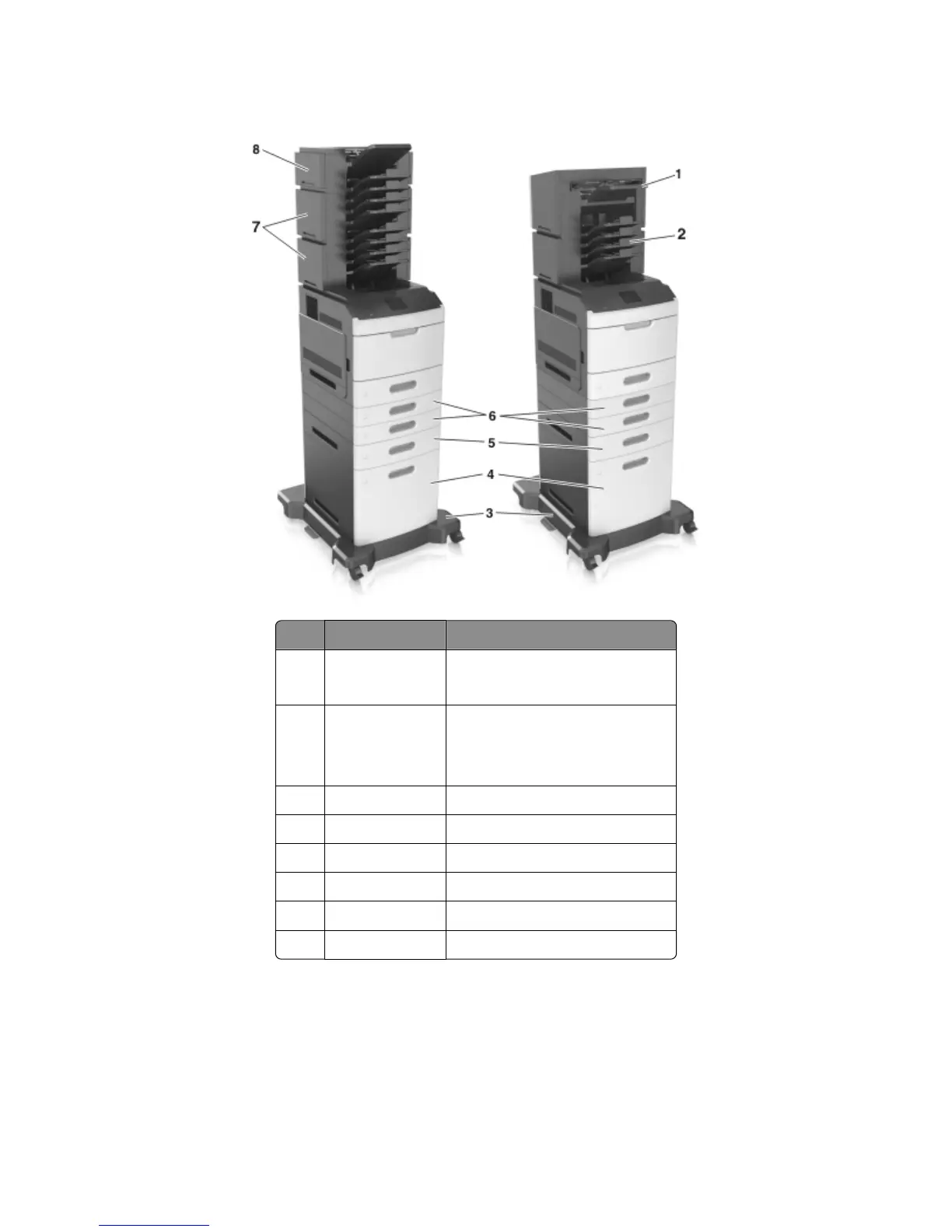 The following illustration shows the maximum number of optional finishers and trays that are supported by the printer.