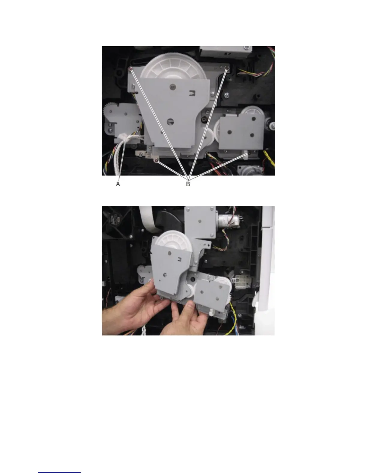 8 Remove the four screws (B) securing the main drive motor to the machine.