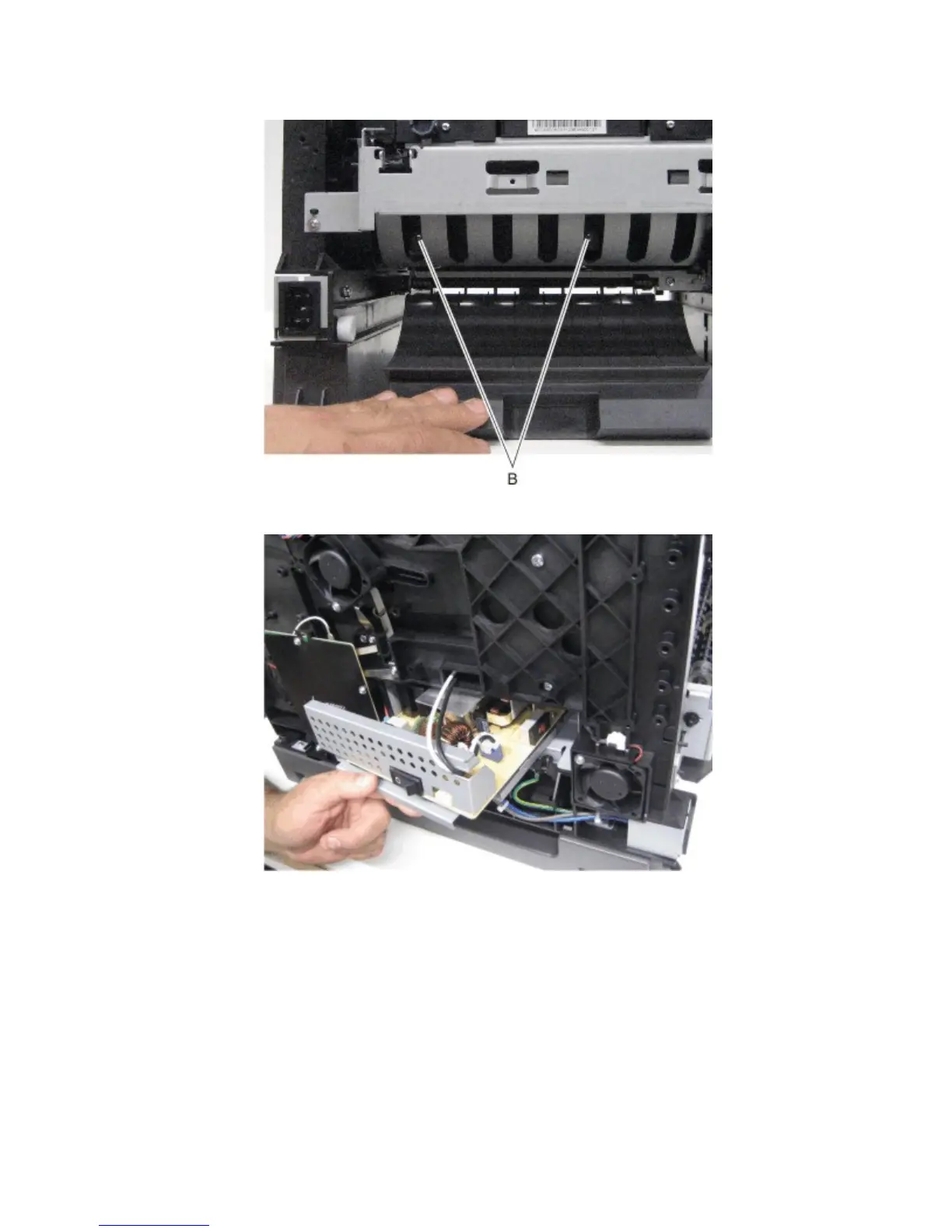 4 While holding down the duplex rear flap, remove the two screws (B) securing the LVPS to the machine.