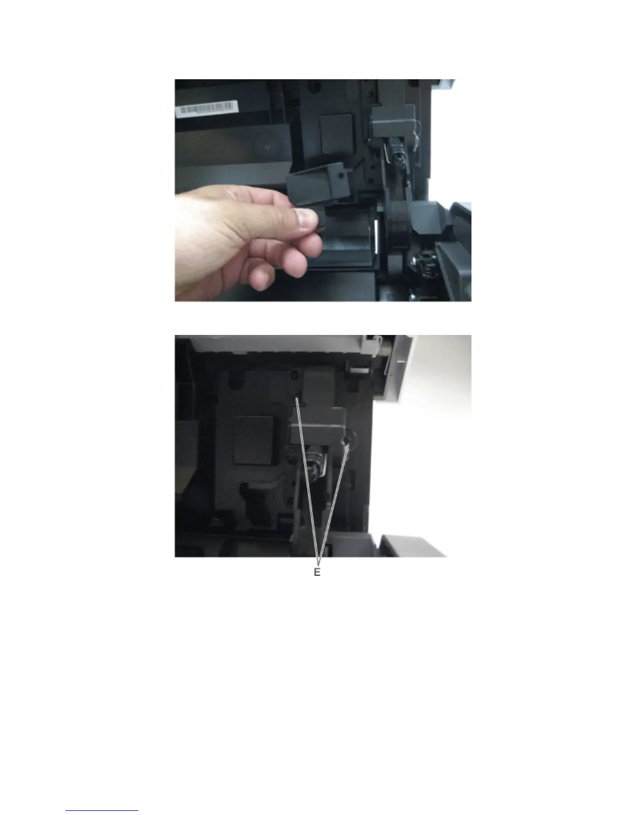 11 Remove the two screws (E) securing the right control panel hinge to the control panel.