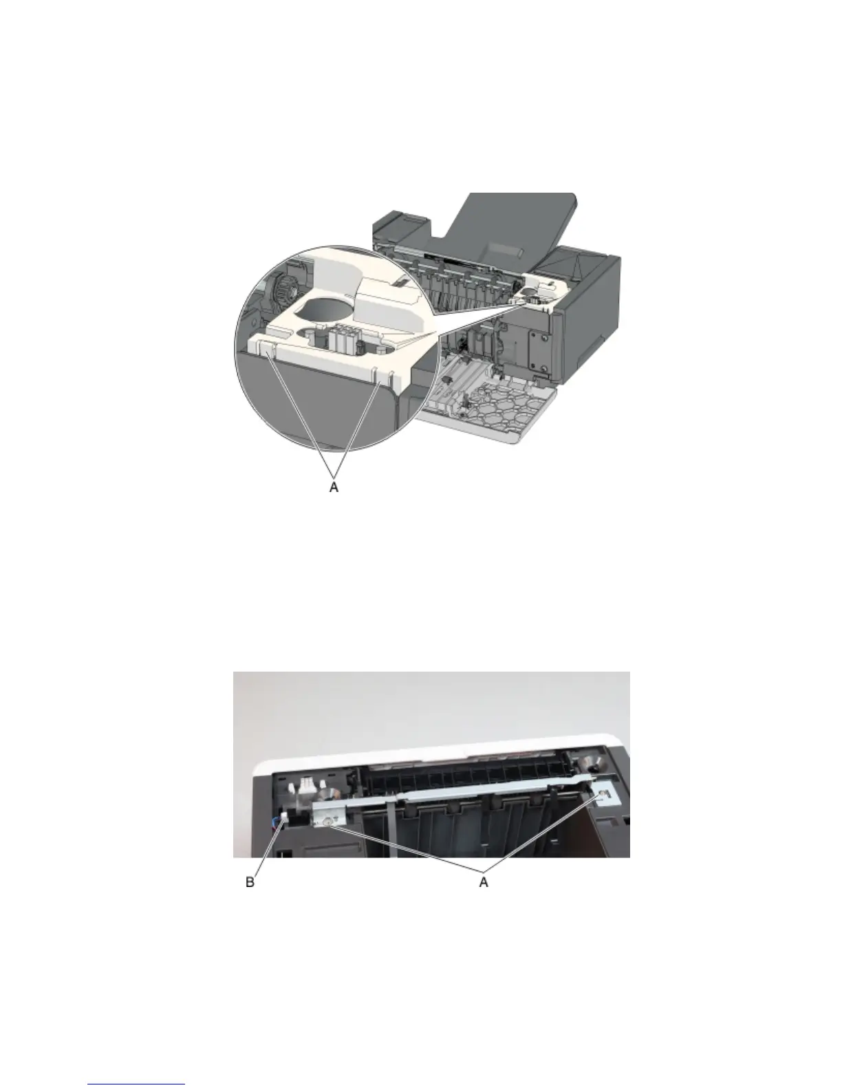 4 Disconnect the cable (B), and remove the sensor (media bin full) with flag.