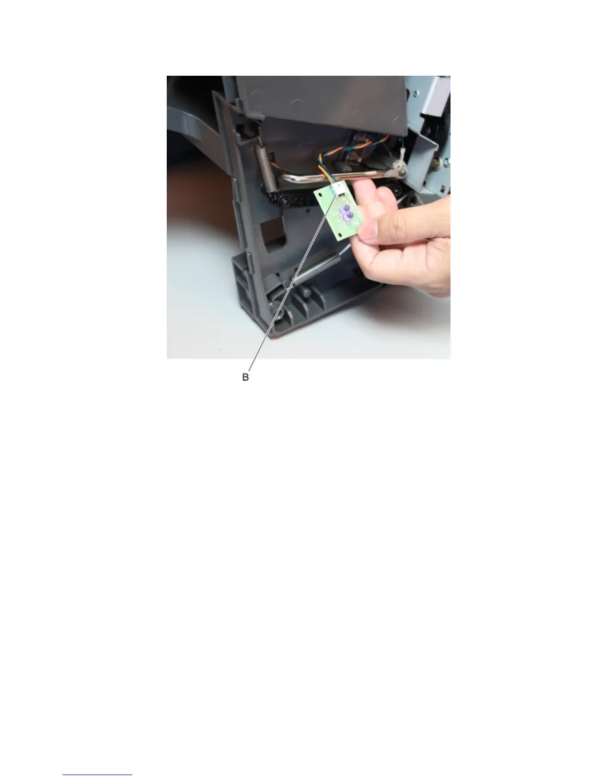 3 Disconnect the cable (B), and remove the sensor (bin full send).