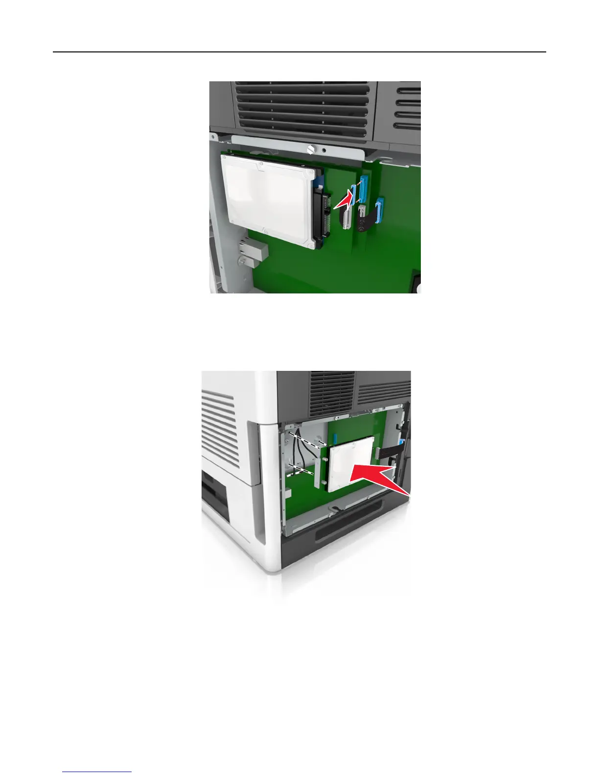 4 Align the standoffs of the printer hard disk to the holes in the controller board cage, and then press the printer hard