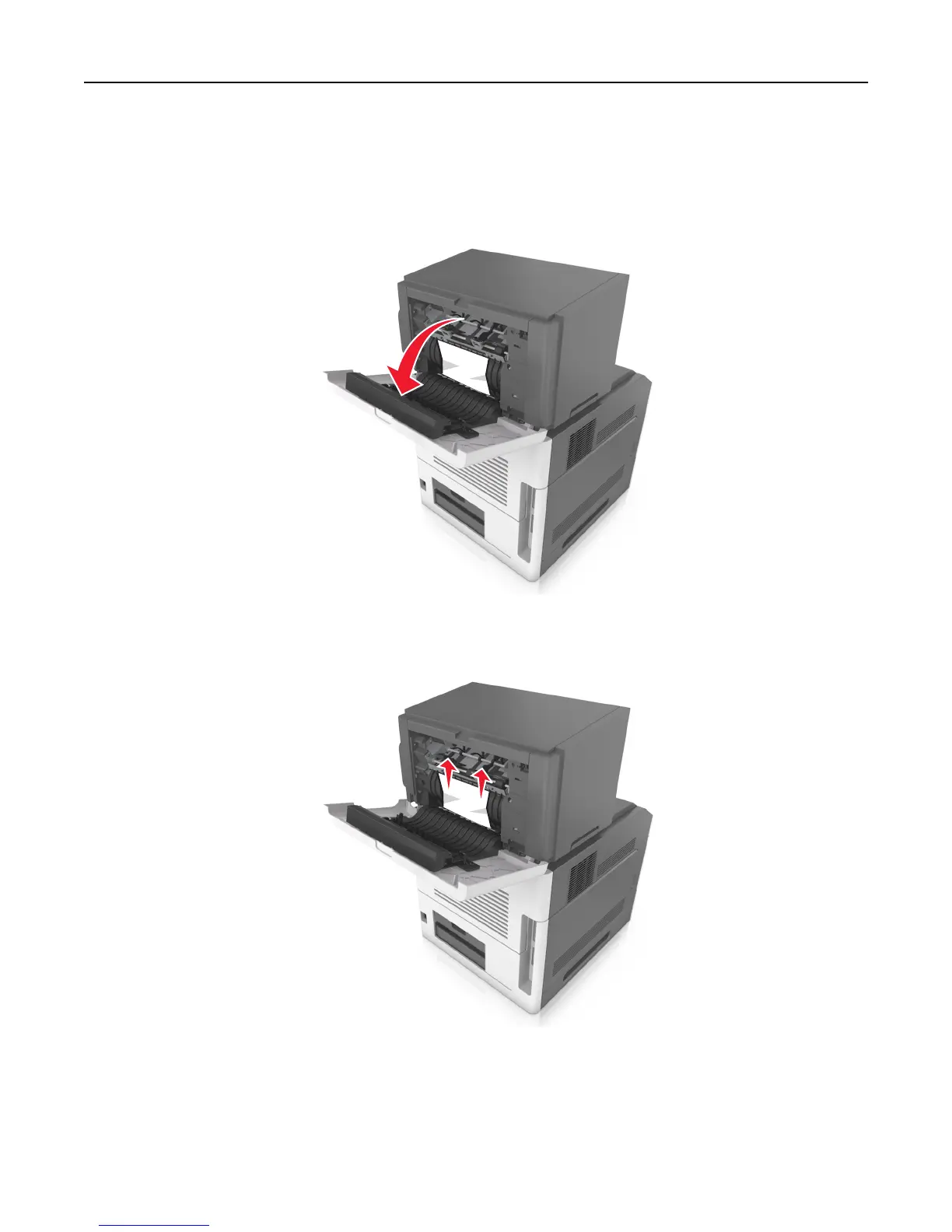 [x]‑page jam, remove paper, open finisher rear door. Leave