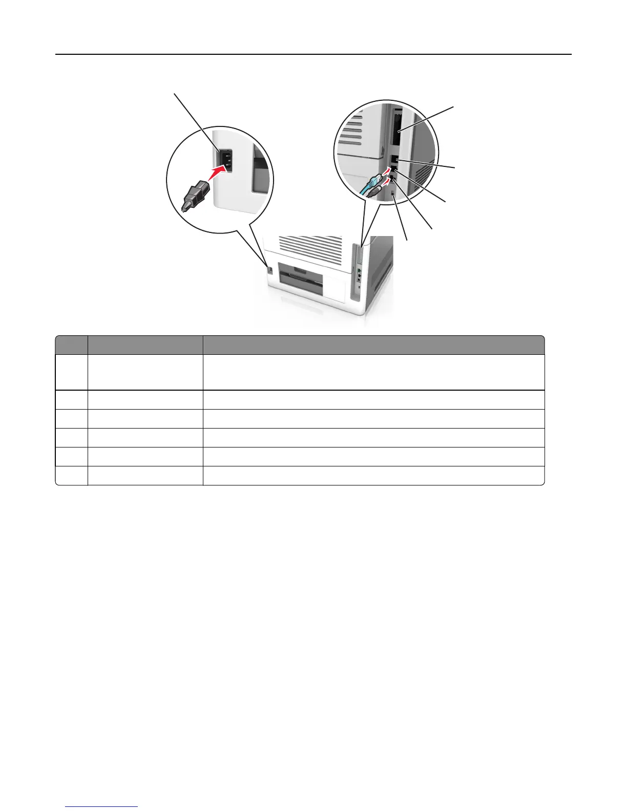 6 Printer power cord socket Connect the printer to a properly grounded electrical outlet.